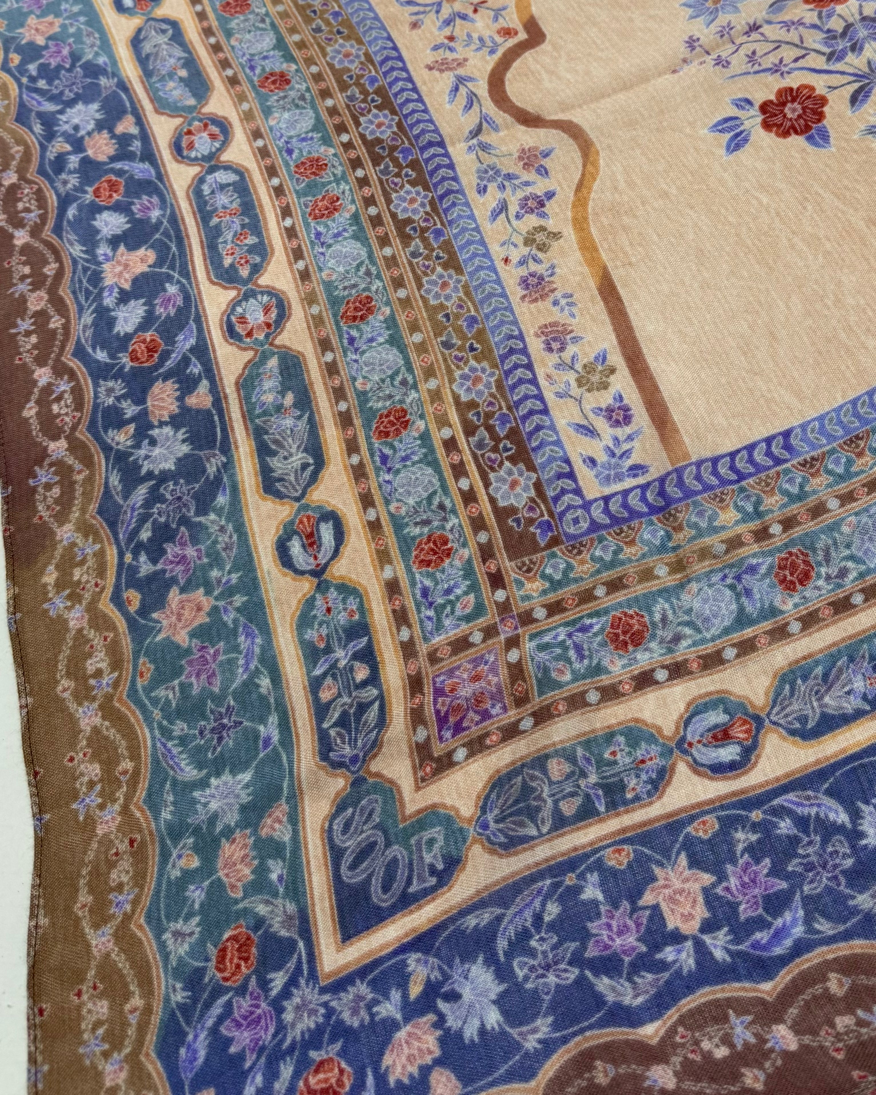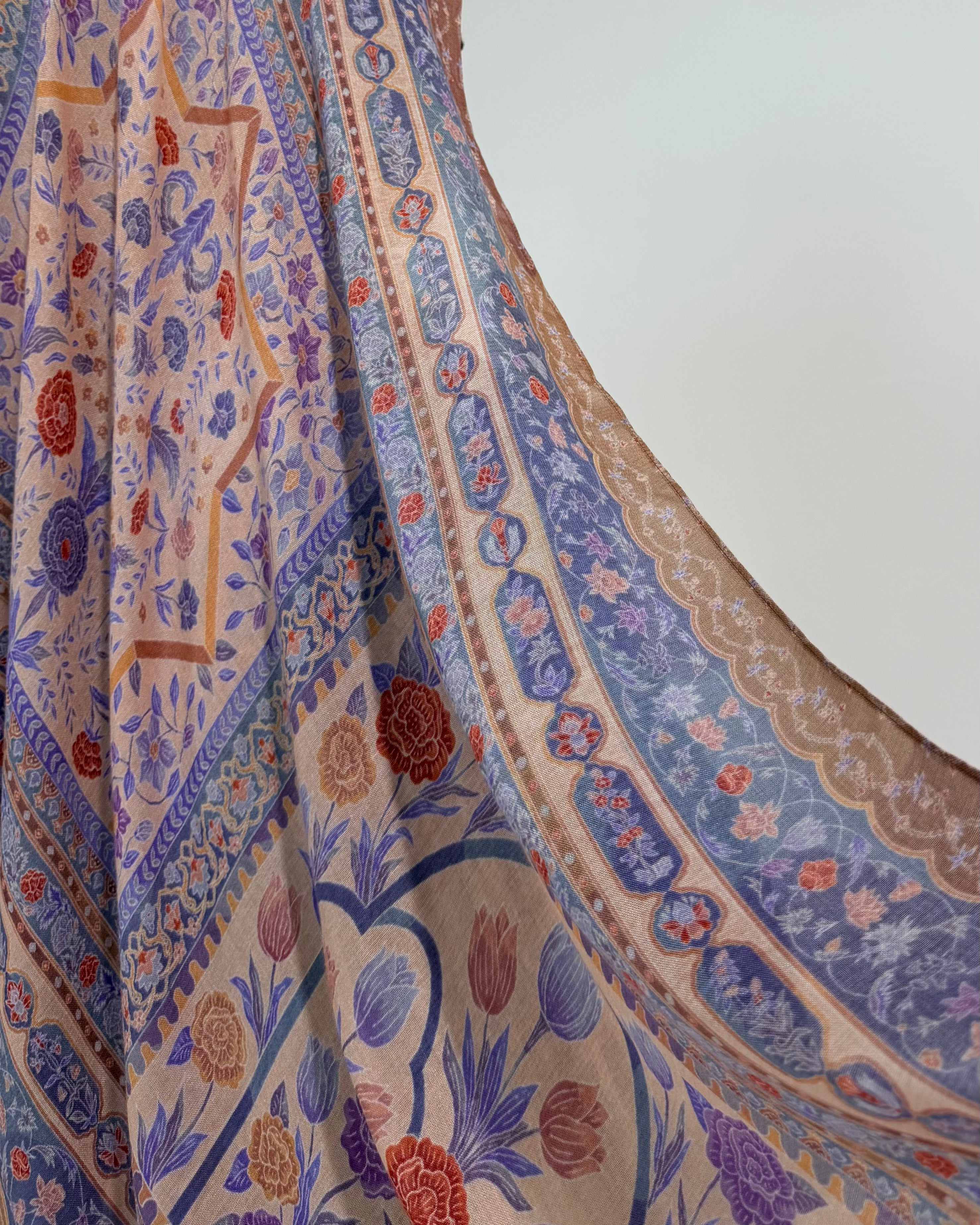 Parvaneh follows a Charbagh-inspired structure, divided into four distinct “garden chambers,” each enclosed by its own geometric pavilion frame. Inside every chamber, the florals are arranged like miniature garden plots, symmetrical, gridded, and densely planted, echoing the ordered layouts of classical Mughal quadrants. Slim ornamental pathways separate one chamber from the next, while the entire composition is encircled by a multi-tiered border system resembling an enclosing garden wall. The result is a structured, horticultural blueprint rendered through intricate floral and vine motifs.