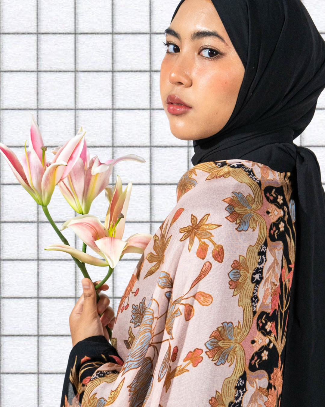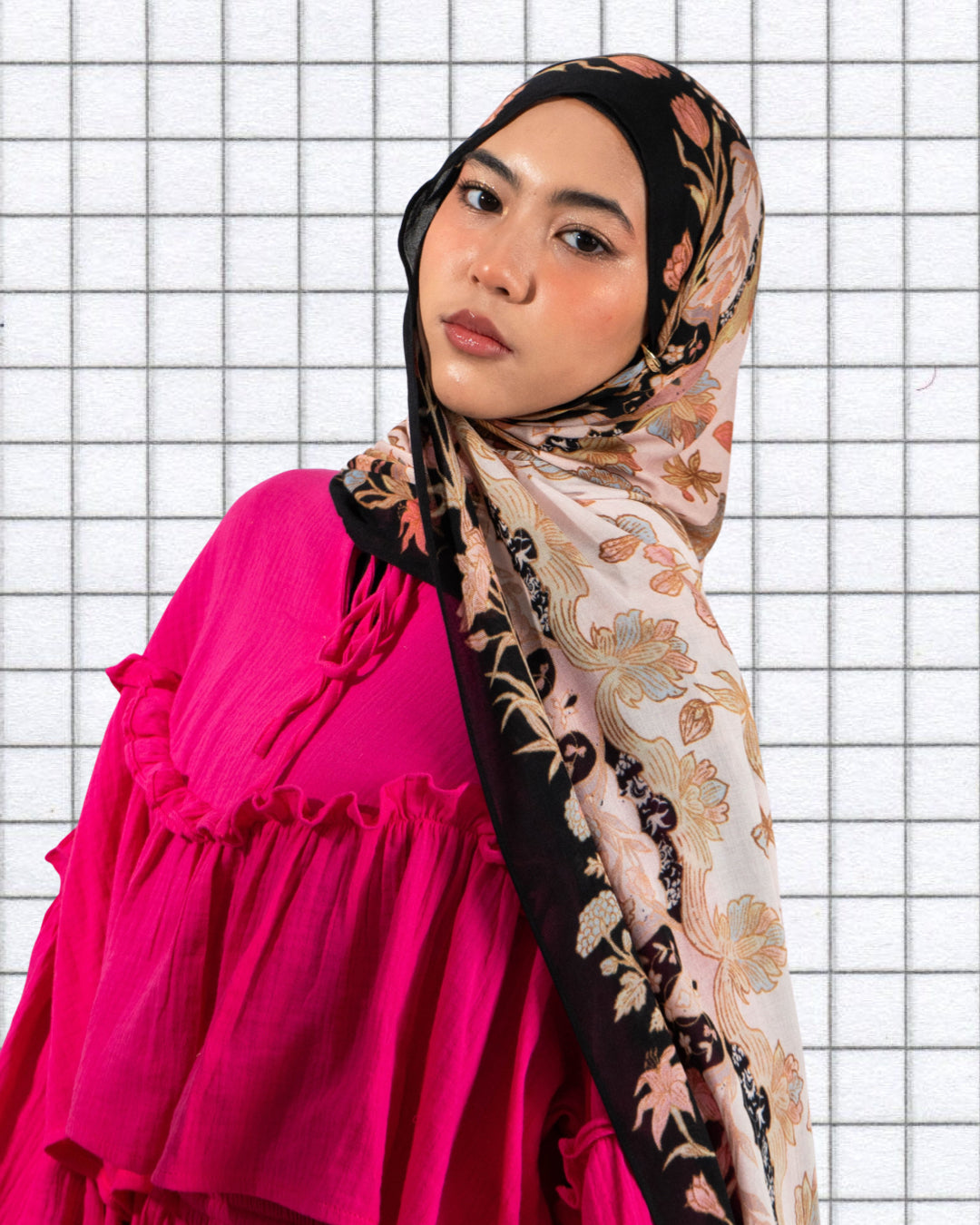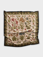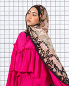 On Korean chiffon, the motifs stand crisp and high-contrast. On Soof modal, the dark border softens into a matte frame, while colours diffuse gently into the ivory ground for a quieter textile effect.